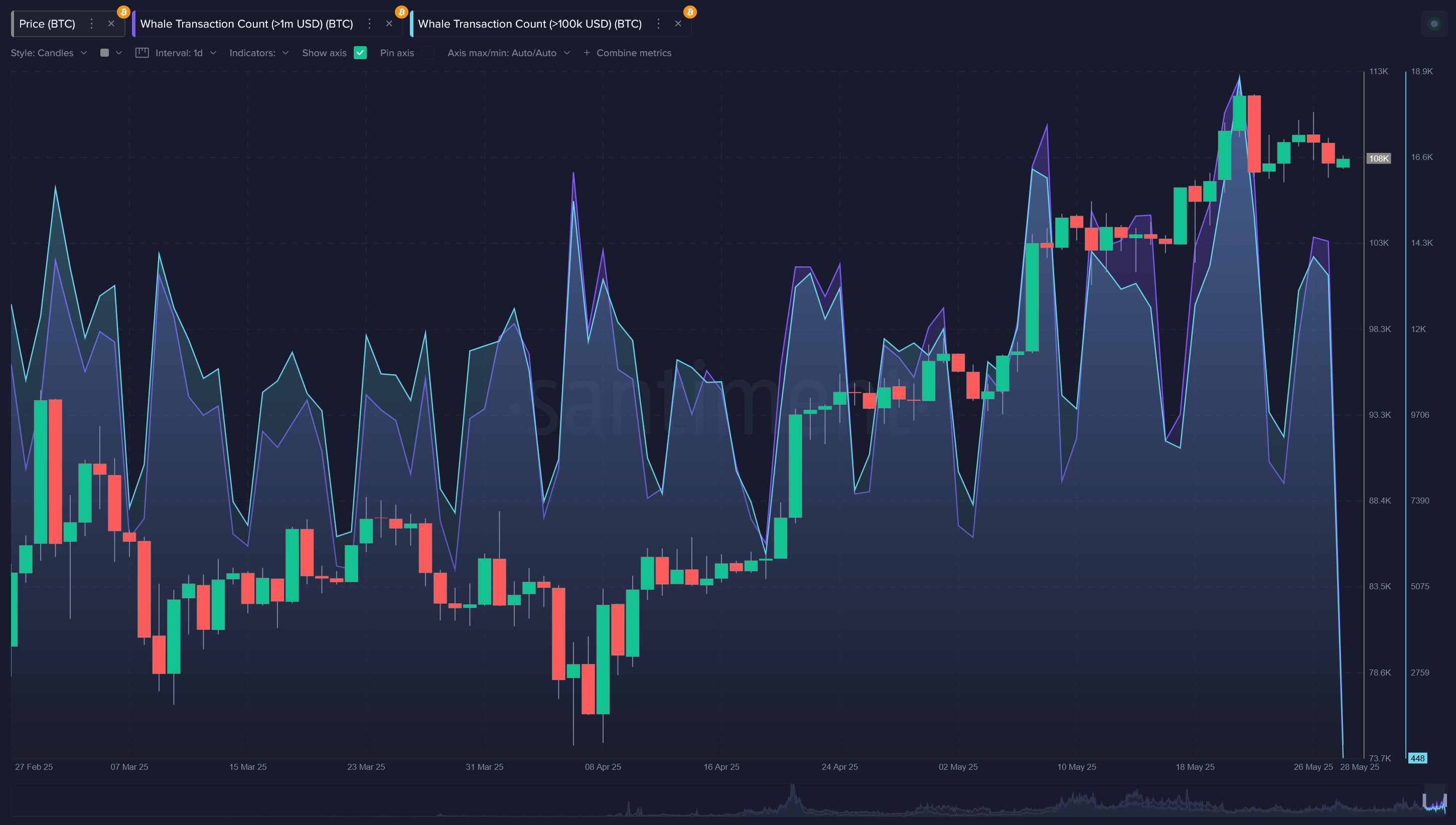 “Hoge walvisactiviteit tijdens markttoppen kan soms wijzen op distributie, of slim geld dat winst neemt. We hebben consequent plotselinge grote walvistransactie -spikes gezien die prijs bodems markeren (zoals die we zagen op 7 april 2025) of prijstoppen (dwz 22 mei 2025),” schreef het.