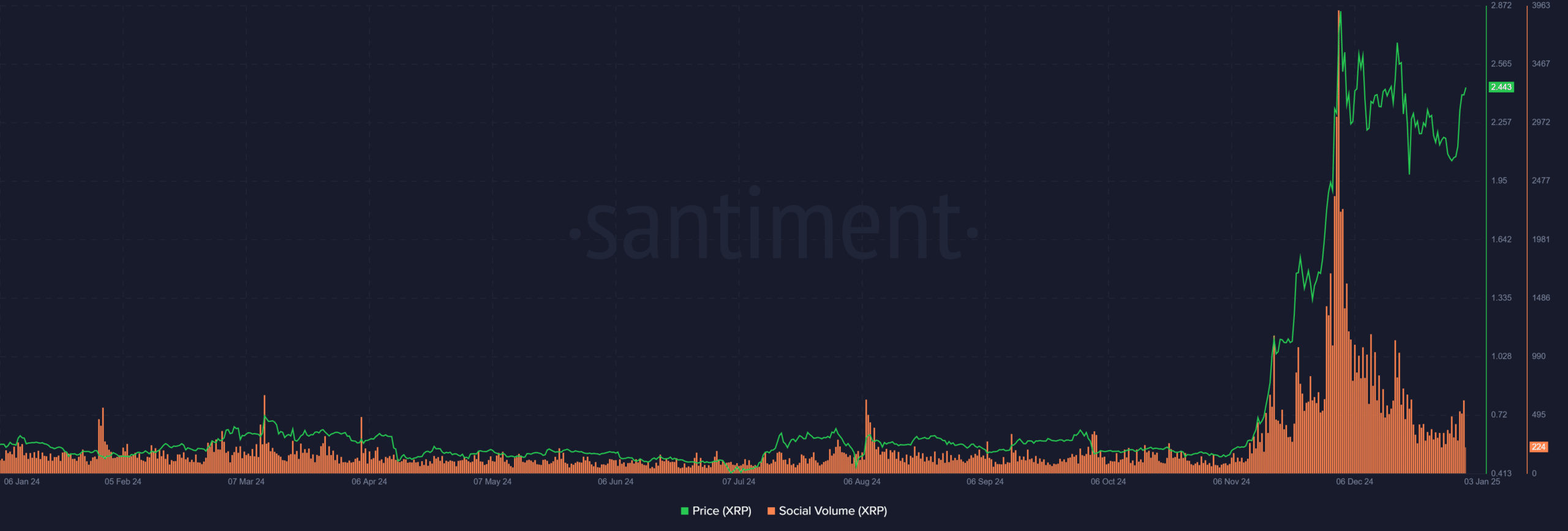 De Crypto Fear and Greed Index, op 74, duidde op een sterke bullish stemming en naderde het gebied van ‘hebzucht’. De markt gonsde van de toegenomen belangstelling, vooral in combinatie met een stijging van het sociale volume van XRP.