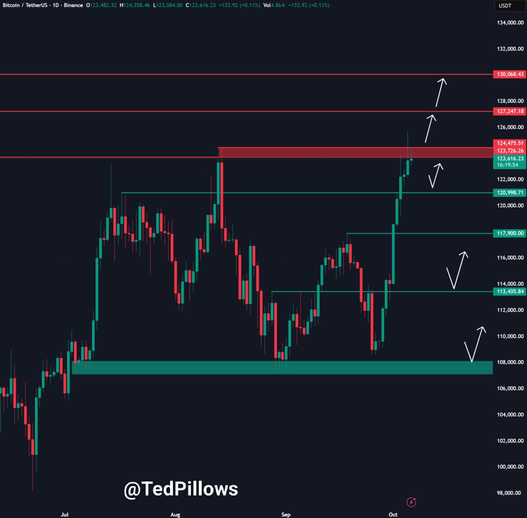 “Bitcoin moet bewijzen dat deze weerstand van $ 124K een verzwakkend punt van afwijzing is. En elke ondiepere dip of terugtrekking van hier zou precies dat doen.”