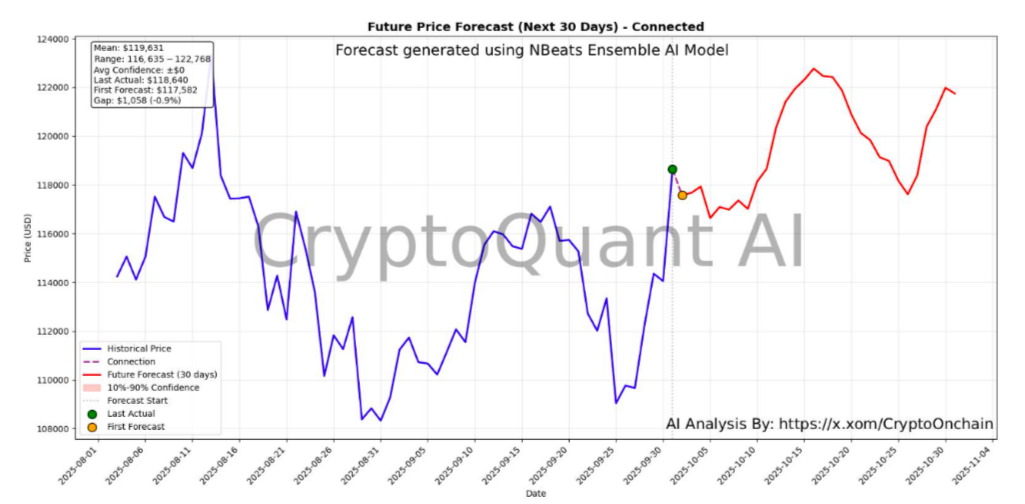 “Door de technische analyse te combineren met de voorspelling van het AI-model, is het meest waarschijnlijke scenario voor oktober 2025 de voortzetting van de neutrale, bereikgebonden beweging van Bitcoin,” is Cryptoquant voorbij.