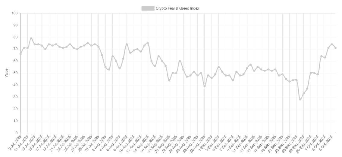 Op zondag trof de index de lokale hoogtepunten van 74/100 en stopte hij tekort aan zijn “Extreme Greed” -zone om terug te vallen naar 71/100 om de week te beginnen.
