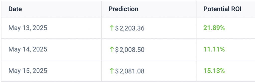 De prijs van Ethereum kan al snel stijgen. Gegevens uit Coincodex geven aan dat de bovenste altcoin naar verwachting de komende dagen met 21% zal stijgen. De prijs van ETH zal een recordhoogte bereiken op 15 mei na een stijging van 15,20%. Merk op dat de prijs van het actief op 13 mei $ 2.203 zal zijn. De prijs van het actief is aanzienlijk gestegen ten opzichte van het huidige niveau.
