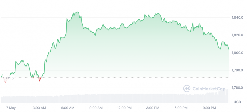 De prijs van Ethereum heeft vandaag een lichte stijging gezien. De grootste altcoin ter wereld heeft de afgelopen 24 uur een stijging van 1,54% gezien. Ongeveer vanmorgen had ETH een handel op $ 1766,65 en sprong toen naar $ 1849,66. Vanaf het schrijven werd dit actief gewaardeerd op $ 1.803,64.