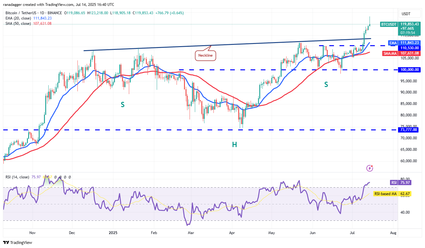 BitcoinBTC() Begon de week met een knal, die boven $ 123.000 toeneemt. Hogere niveaus hebben echter enige winst gezien. Bulls proberen de prijs meer dan $ 120.000 te houden. Dit is een positief teken.