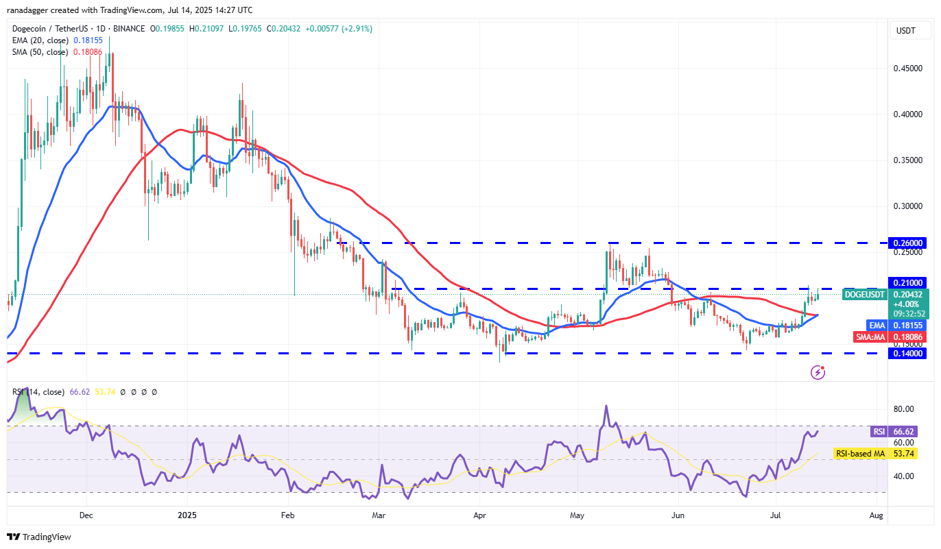 Het pad van de minste weerstand is omhoog, omdat de 20-daagse EMA (0,18) een upslop heeft en RSI het overboughtgebied nadert. De Doge/USDT kan $ 0,26 bereiken als kopers de prijs meer dan $ 0,21 duwen. De verkopers zullen waarschijnlijk de prijs van $ 0,26 verdedigen, maar als stieren winnen, kan het paar tot $ 0,35 stijgen.