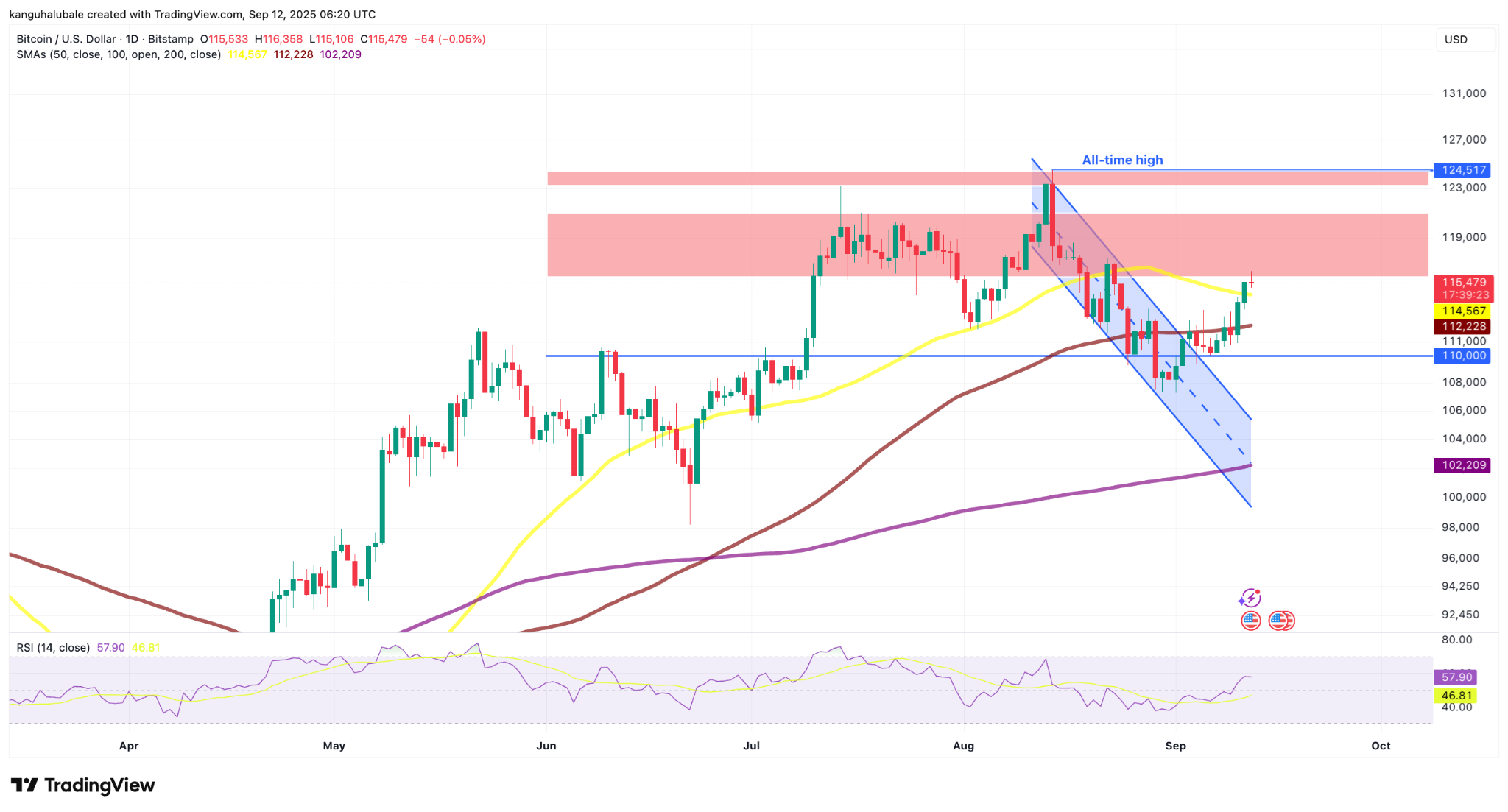 • BTC moet meer dan $ 115.000 vasthouden om het herstel veilig te stellen, met weerstand op $ 116.000-$ 121.000.