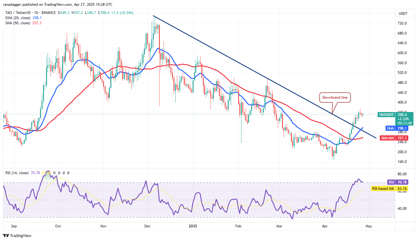 De opwaartse beweging wordt geconfronteerd met weerstand op $ 375. De pullback zou echter ondersteuning moeten vinden in de buurt van de 20-daagse EMA (298). De 20-daagse EMA is een goede indicator voor een verschuiving in het sentiment van de markt. Het geeft aan dat minder mensen kopen bij rally’s en meer kopers op dalingen. Bulls proberen het paar Tao/USDT boven $ 375 te duwen. Het volgende doel kan $ 495 zijn als ze succesvol zijn.