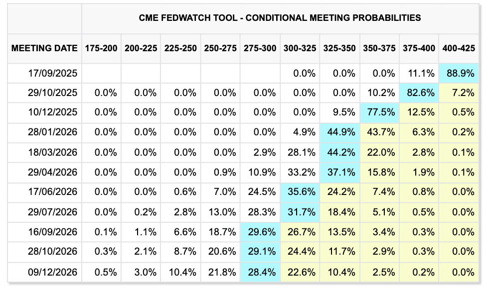 Na het CPI -rapport is de kans op de Fed die de tarieven verlagen tijdens de vergadering van 17 september alleen maar toegenomen. Een kans van 11% zien Als de reductie groter is dan het minimum van 0,25%.