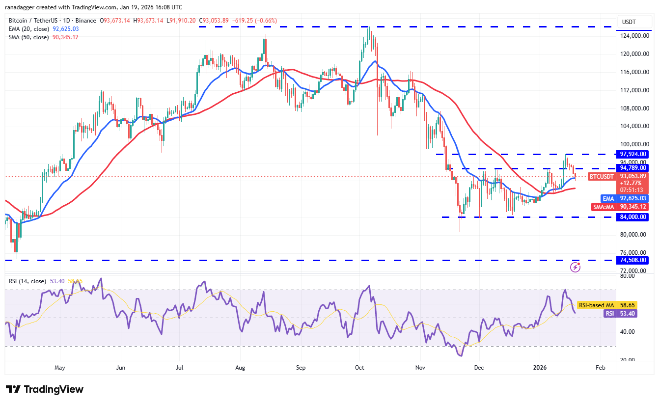 BTC heeft zich teruggetrokken naar de 20-daagse EMA (92.625). Dit is een belangrijke ondersteuning op korte termijn.