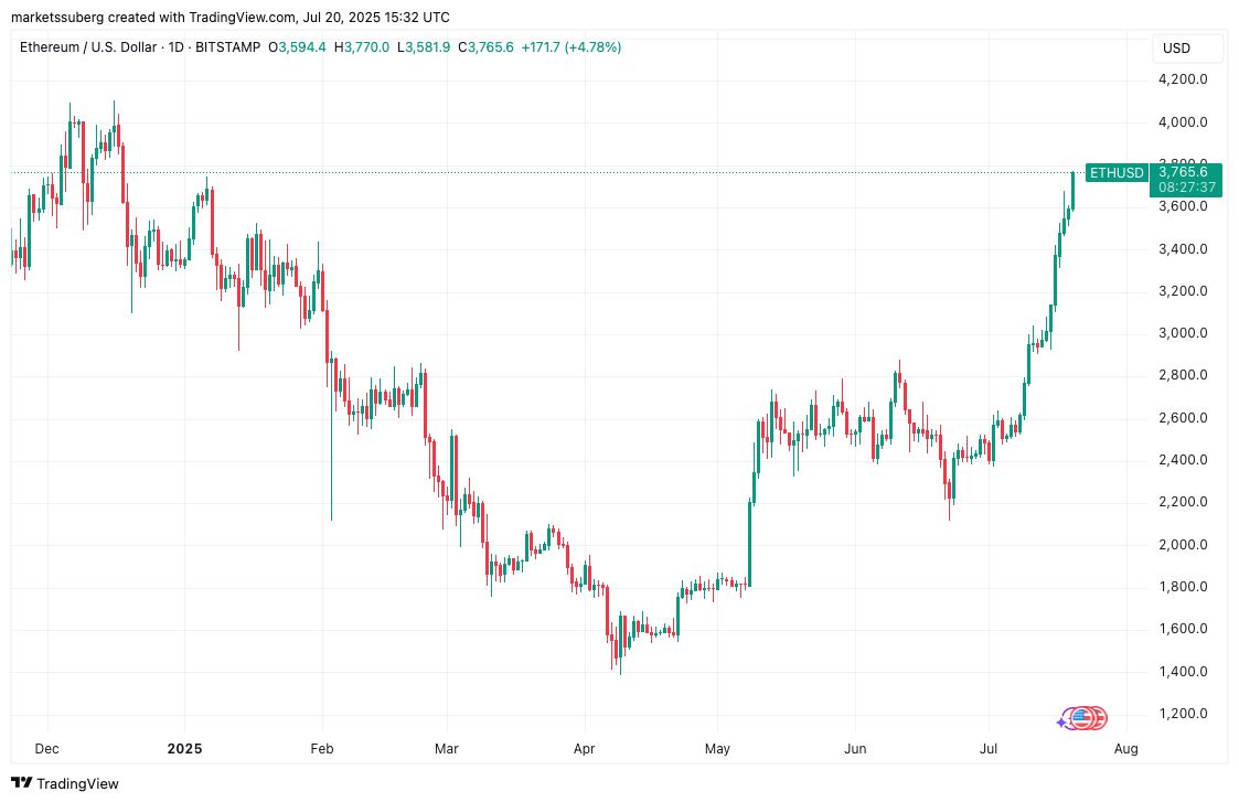 Het ETH/USD -paar verhandelde zondag op $ 3.750 voor het eerste sinds 18 december 2024.