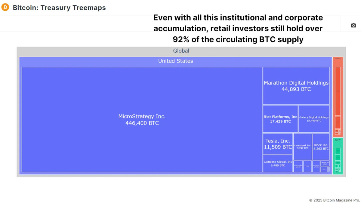 Bitcoin ETF’s hebben misschien meer dan een miljoen BTC verzameld, maar dit is slechts een fractie van het totale aanbod van 19,8 miljoen BTC. Bedrijven zoals MicroStrategy Honderdduizenden BTC zijn in handen van instellingen, wat ook heeft geholpen bij de institutionele adoptie. Het grootste deel van Bitcoin is nog steeds in handen van individuele beleggers, wat ervoor zorgt dat de marktdynamiek gedreven zal blijven door vraag en aanbod.