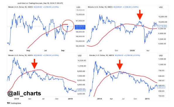 Martinez bekendgemaakt Hij wees erop dat de prijs van Bitcoin in het verleden ernstig werd beïnvloed door het niet bereiken van dit cruciale supportniveau. Er werden vergelijkbare voorbeelden gegeven. bearishe trends Bitcoin bereikte het ondersteuningsniveau niet in 2014, 2018 en 2020.