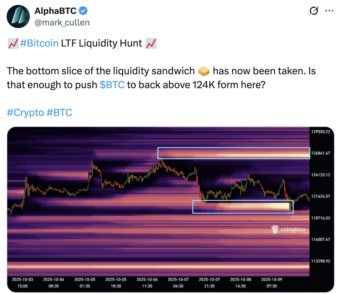 AlphaBTC is een vergelijkbare cryptocurrency. verklaard Marktdeelnemers zijn nu meer gefocust op liquiditeit boven de $126.000, omdat de prijs van de valuta de liquiditeit in het lagere bereik heeft opgeruimd.
