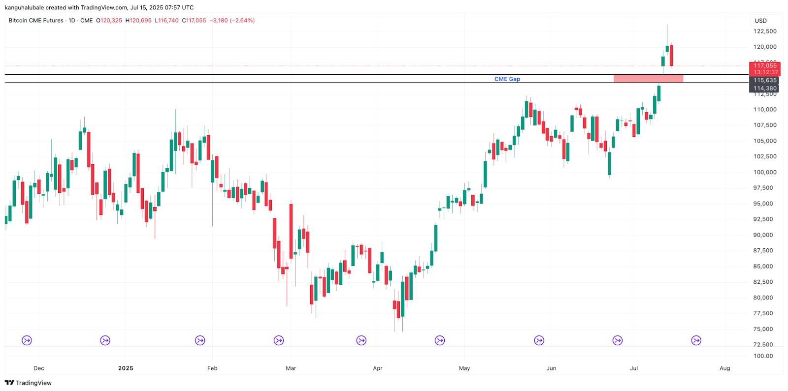 Bitcoin’s recente rally heeft een CME Futures Gap Tussen $ 114,380 tot $ 115.630. Futures -lacunes worden meestal “gevuld”, meestal zullen handelaren deze niveaus benaderen op basis van een punt van ondersteuning of weerstand, afhankelijk van de marktstructuur.