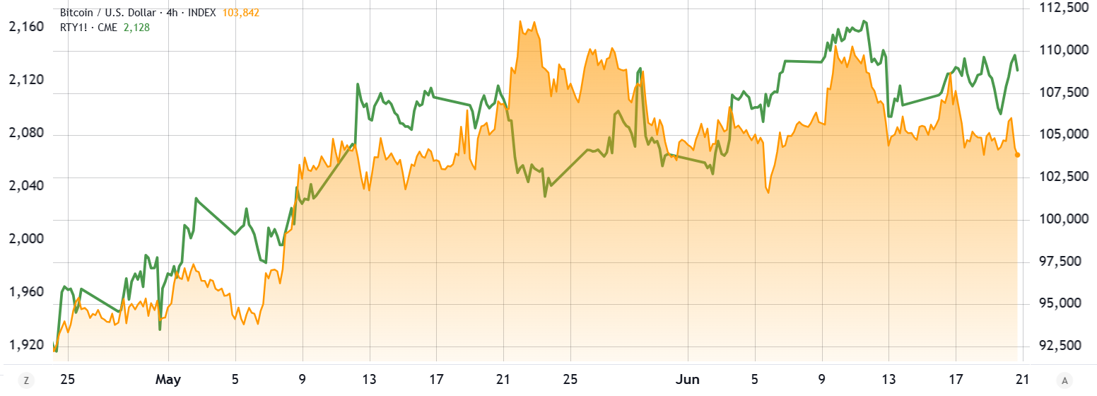 Russell 2000 Index (groen, links) vs. Bitcoin/USD. Bron: TradingView/Cointelegraph