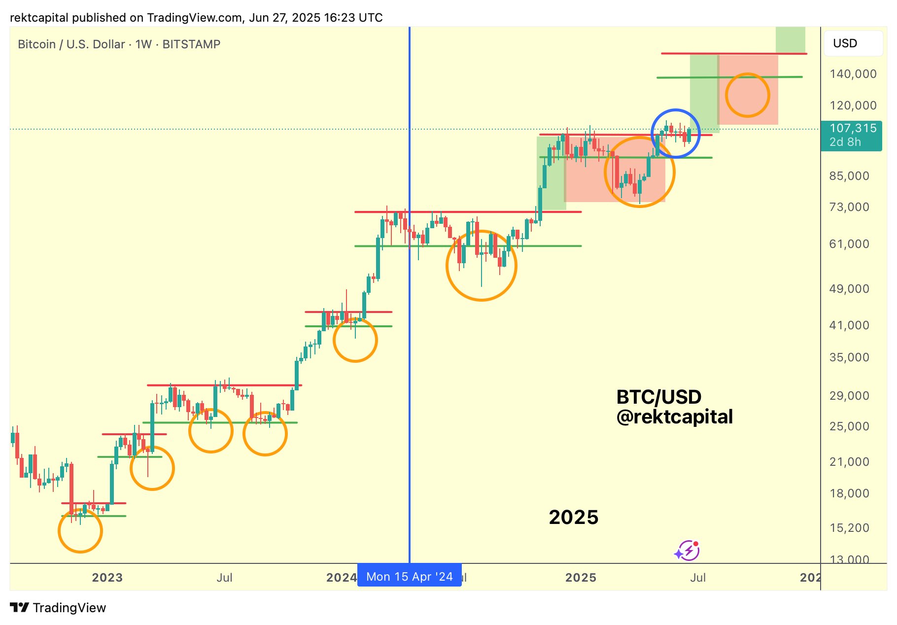 BTC/USD 1 weken durende grafiek. Bron: Rekt Capital/X