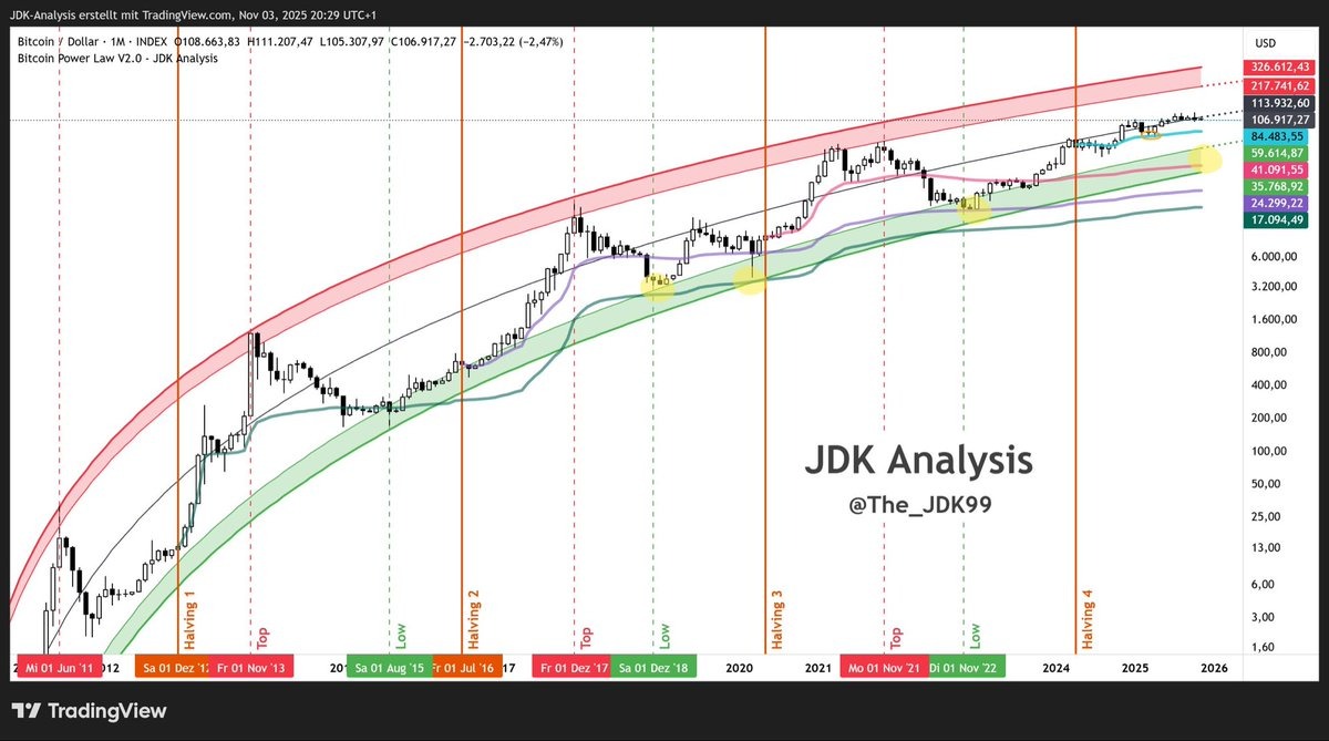 BTC/USD maand-tot-maandgrafiek met energiewetgeving-mannequin. Levering: JDK-evaluatie
