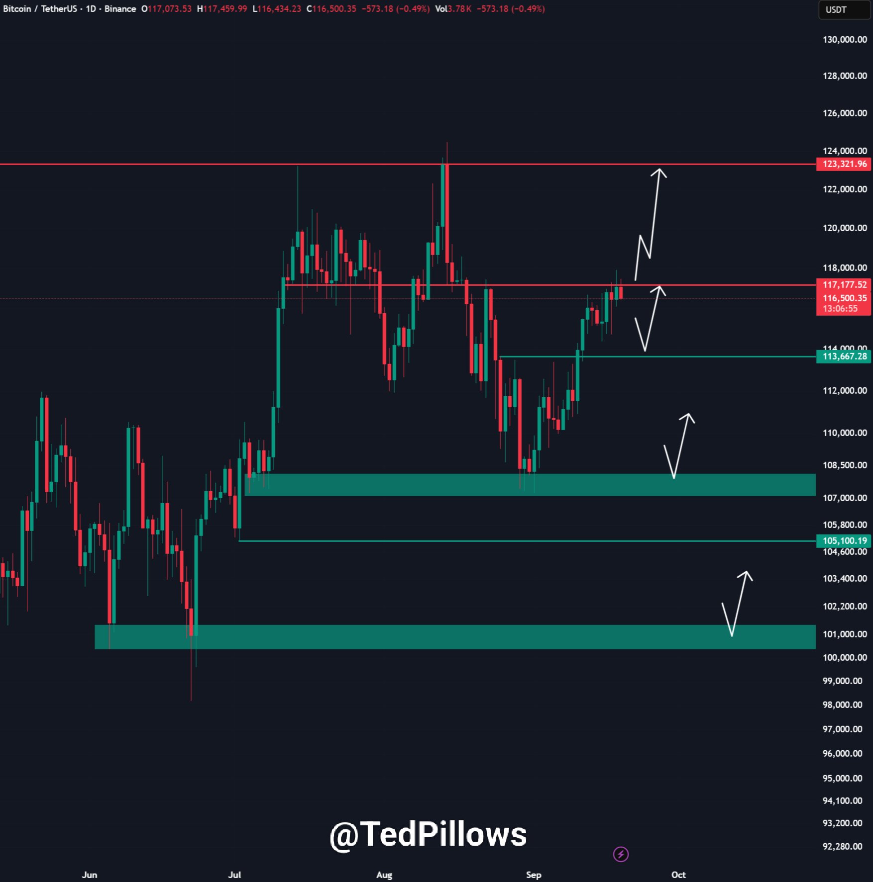 Bitcoin sluit niet op $ 117.200. Dit opent de deur voor hertests.
