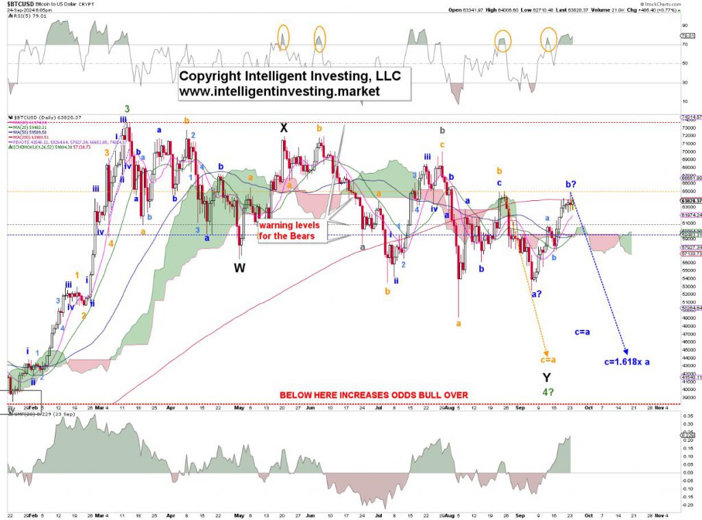 Bitcoin zou kunnen stijgen tot $80-90k. Het patroon dat deze grafiek laat zien, staat bekend als een “einddiagonaal,” Beide grafieken tonen dezelfde data. De prijs van Bitcoin moet boven de dieptepunten van september blijven.