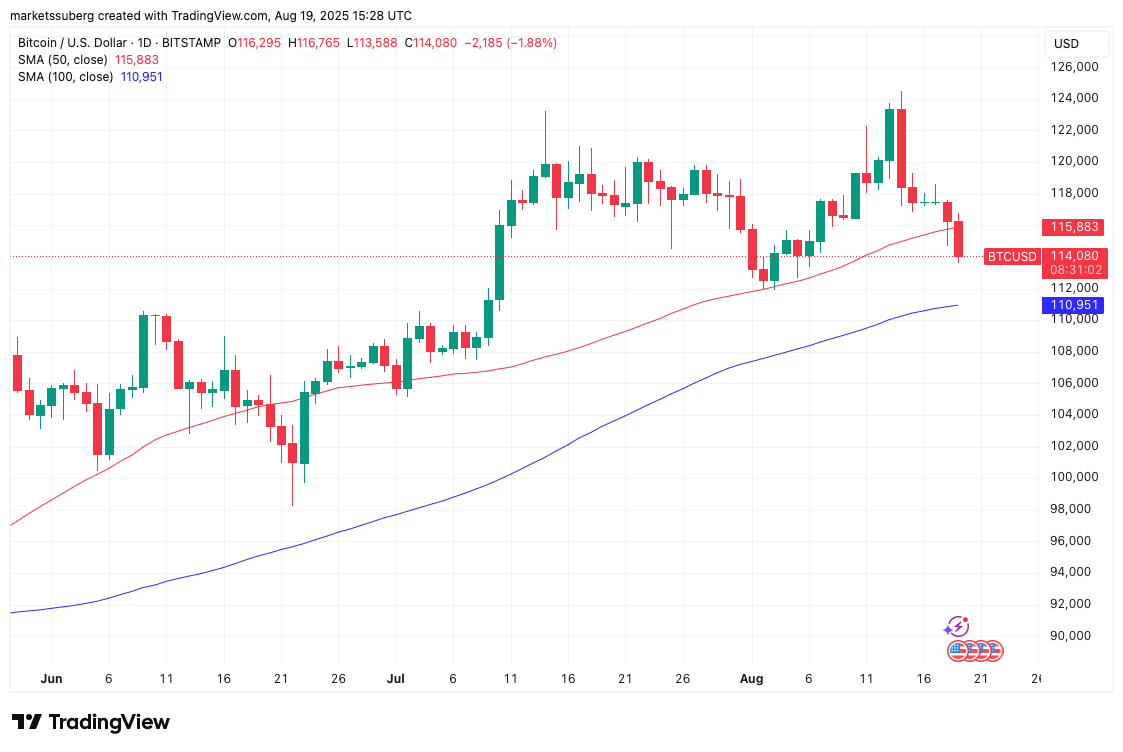 De gegevens van Cointelegraph Markets Pro Hierna volgen enkele voorbeelden van hoe u aan de slag kunt: TradingView toonde BTC/USD die onder $ 114.000 daalde.