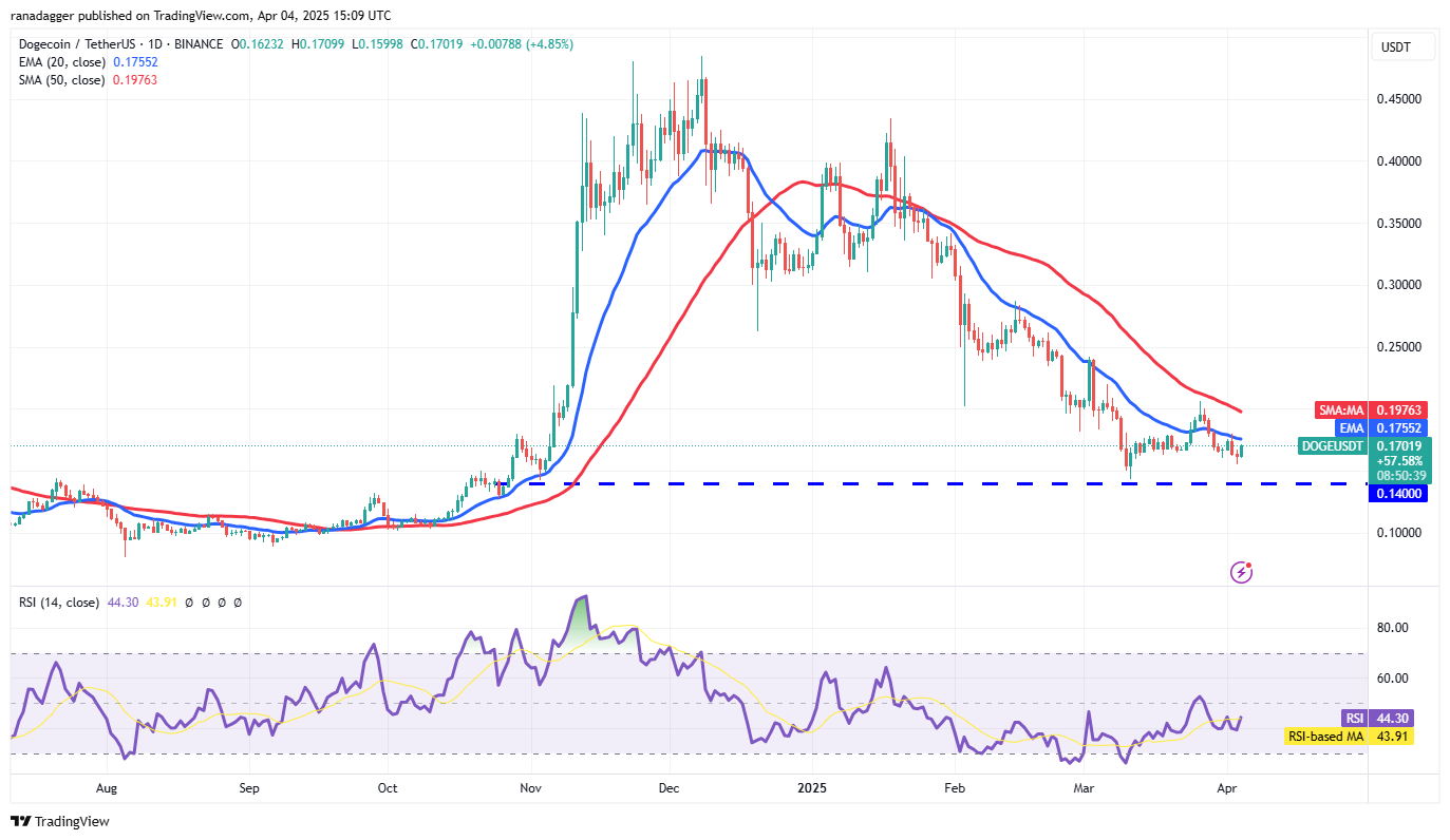 DogecoinDOGE) draagt door de Bulls gedwarsboomde pogingen om de prijs boven de 20-daagse EMA ($ 0,17) op 2 april te duwen.
