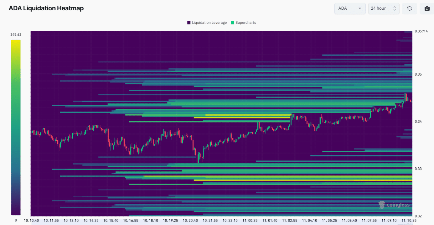 ADA zou zijwaarts kunnen blijven bewegen als gevolg van een groot aantal liquidaties boven de prijs op het moment van schrijven. Een hete liquidatiezone is doorgaans een goed niveau voor weerstand.