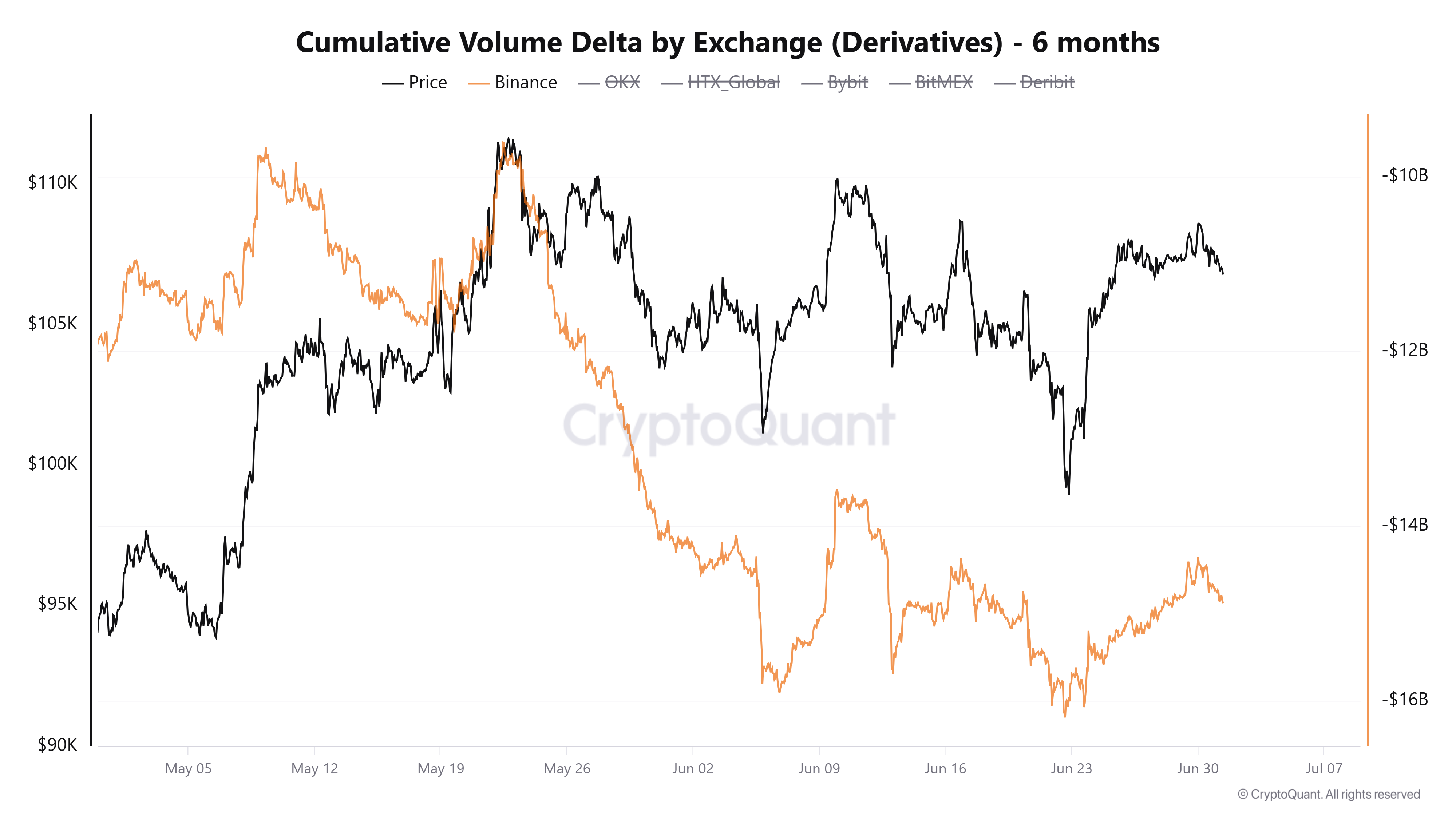 Ondanks aanhoudende agressie aan de verkoopzijde op binance-derivaten in de afgelopen 45 dagen, heeft Bitcoin zijn grond gehouden binnen een strak $ 100.000-$ 110.000 bereik. Cumulatieve volume delta (CVD) gegevens overblijfselen Negatief, wat een consistente druk op korte verkopers van de afnemers aangeeft. Maar het feit dat de prijs niet onder het huidige niveau kan breken, suggereert dat de geldstroom wordt geabsorbeerd.