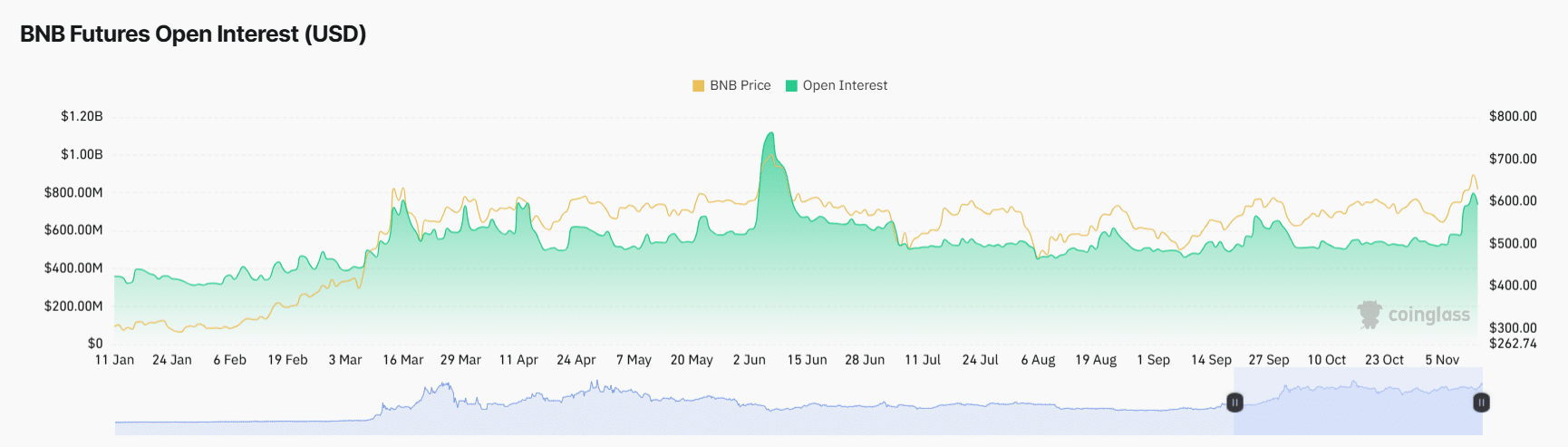 BNB vertoont sinds augustus sterke bullish indicatoren. De dagelijkse grafiek toont zowel hogere hoogtepunten als hogere dieptepunten. De prijsbeweging, gekoppeld aan de stijgende open interessesSinds augustus groeit het vertrouwen op de markt.