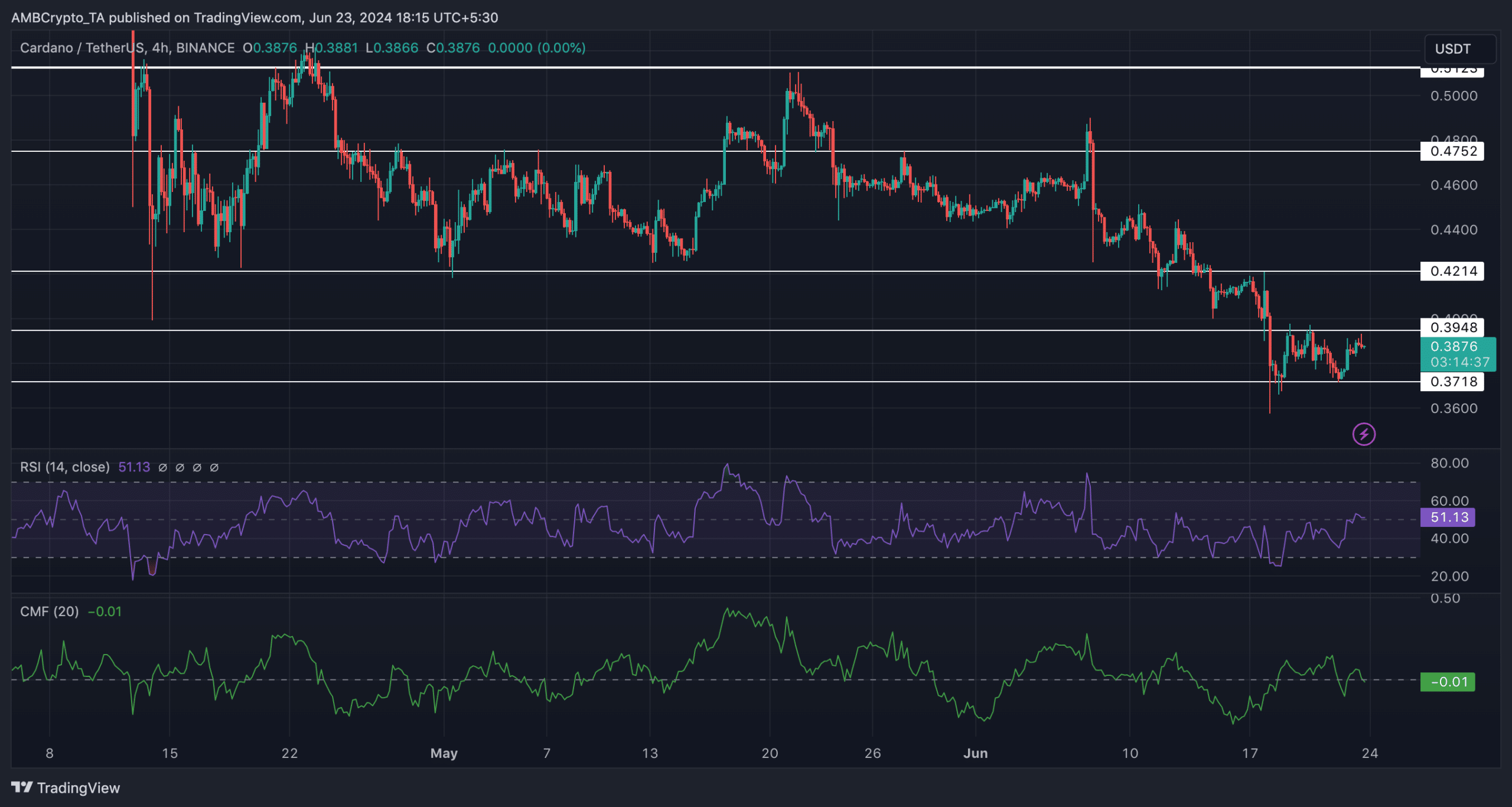 Vanaf het persbericht werd ADA verhandeld tegen $0,3874. De prijs is binnen 24 uur met 2,37% gestegen. De stijging van de ADA-prijs, hoewel aanzienlijk, was niet voldoende om de huidige trend te keren.