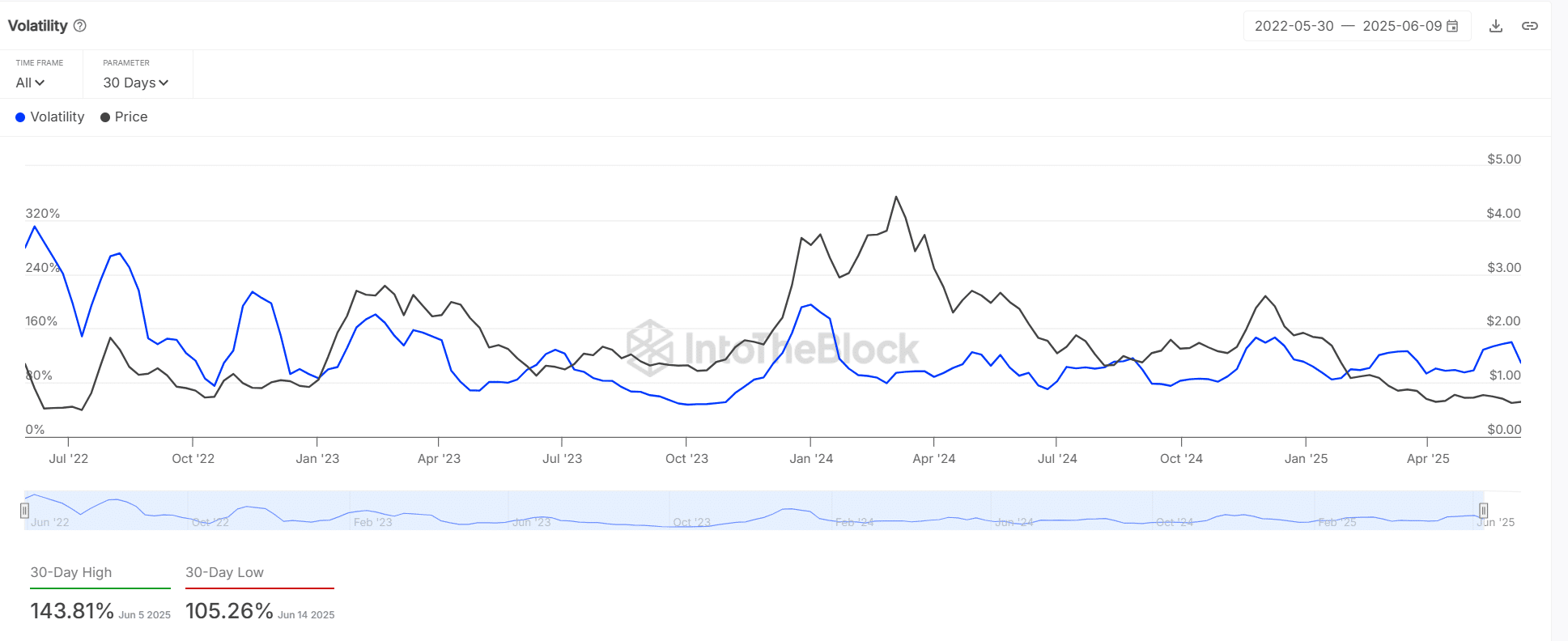 De 30-daagse volatiliteit van het optimisme daalde tot 105,26%. Dit is het laagste niveau in meer dan een maand. In de geschiedenis zijn perioden van lage volatiliteit vaak voorafgegaan aan sterke directionele bewegingen.