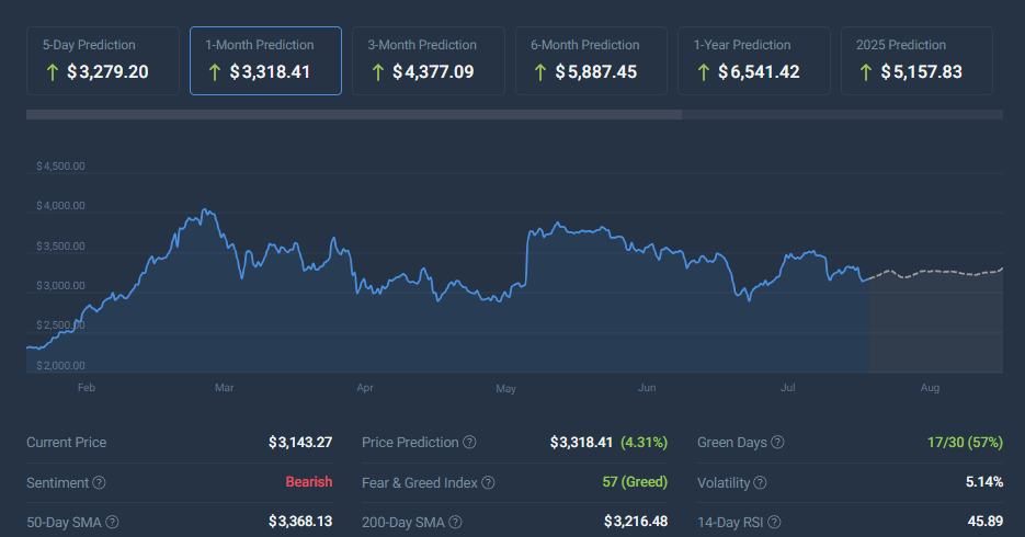 “Volgens onze huidige Ethereum-prijsvoorspelling zal de prijs van Ethereum naar verwachting met 4,31% stijgen en $ 3.318,41 bereiken op 1 september 2024. Volgens onze technische indicatoren is het huidige sentiment bearish, terwijl de Fear & Greed Index 57 (hebzucht) laat zien. Ethereum registreerde 17/30 (57%) groene dagen met 5,14% prijsvolatiliteit in de afgelopen 30 dagen.”
