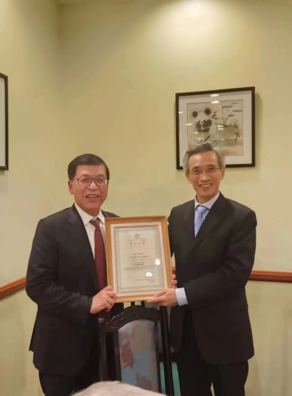 Simon Pang introduced a certificates of being an “honorary overseas director” by then-CPAFFC chair Lin Songtian. Photograph credit score: https://mp.weixin.qq.com/s?__biz=MzIwNTQ0OTYwNg==&mid=2247552559&idx=2&sn=61e11e9f25d804478fcf4eab5c7139ac