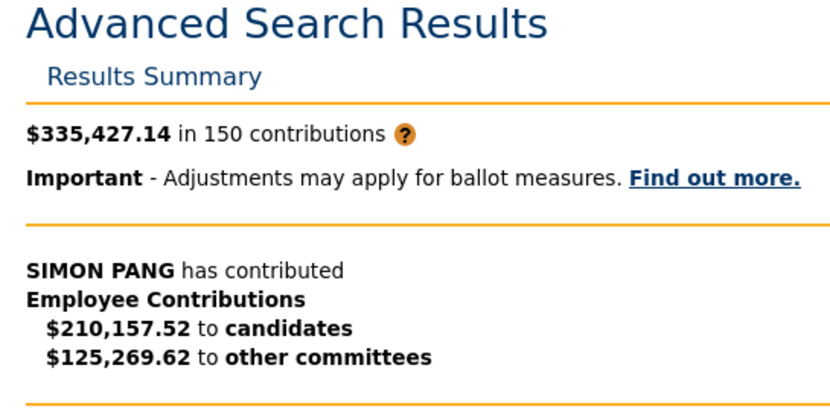 Neither was this degree of spending confined to federal political contributions both — with the LA Mayor’s Fund itemizing Simon Pang as a contributor in their 2023 Annual Report. A fast scan of public state and native political contributions databases reveals Simon Pang, Helen Hong Yu and Kevin Xu popping up a number of instances. For instance, contributions within the tons of of 1000’s have been marked within the California contributions database. Whereas their names are generally conflated, with others (particularly Helen Yu, with a lawyer that works at Yu Leseberg having made $13,100 in contributions), their donations stand out by means of their employers – the identical ones they use for federal contributions, most notably Royal Enterprise Financial institution.