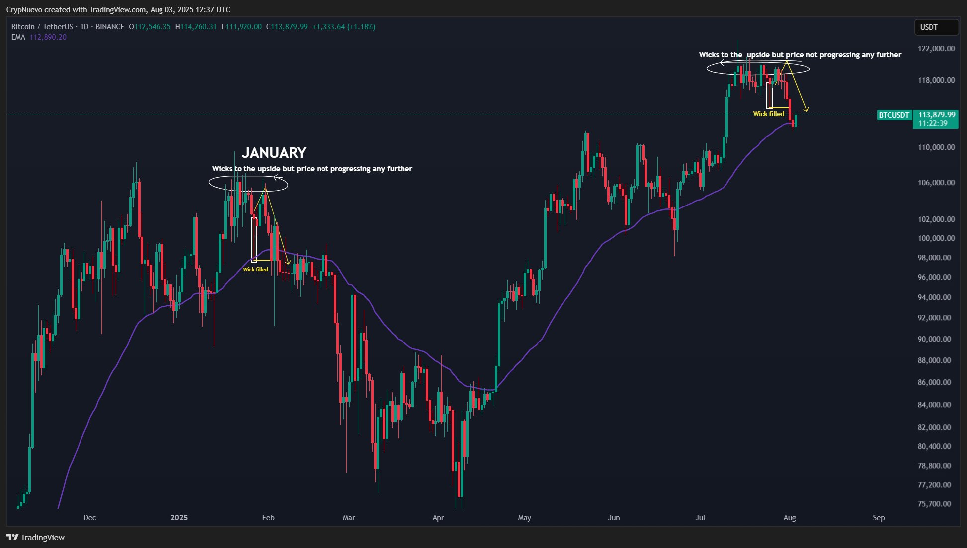 “$ BTC heeft zijn streak van het instellen van de hoge of lage voortgezet in de eerste week van de maand. We zullen moeten zien of augustus anders zal worden”, Laatste analyse Op X.