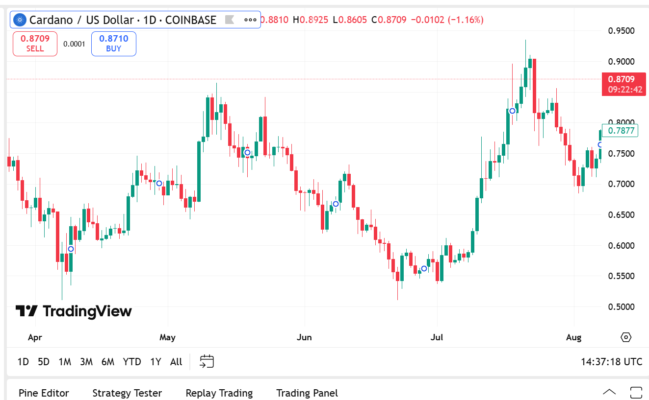 Cardano (ADA) is zeer stabiel geweest met zijn prijs die nu is ingesteld op $ 0,8771, een stijging met 3,14% in de afgelopen 24 uur. De marktkapitalisatie is momenteel op $ 31,31 miljard gedreven door $ 1,63 miljard handelsvolume, hoewel dit met meer dan 37%werd gedaald. ADA staat nog steeds op de horlogelist als een van de beste crypto onder $ 1 die combinatief voor nut en beloning is.