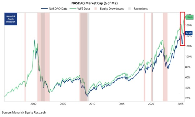 De NASDAQ is nu 129% van het Amerikaanse bruto binnenlands product, bijna het dubbele van de 70% hoog die het in 2000 bereikte. De recordaantallen laten zien hoe aandelenkoersen zowel de geldhoeveelheid als de economie overtreffen.