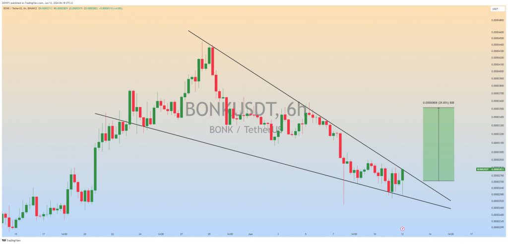 Ook veel analisten waren het met dit idee eens. Clifton Fx, voorheen Twitter (een crypto-expert) suggereerde dat BONK een grote winst zou behalen. “bullish golf.” Het is belangrijk dat de munt breekt uit het Falling Wedge-patroon dat hij op de zes-uurgrafiek vormde. Dit patroon is bullish, maar wordt nog steeds als bearish beschouwd.