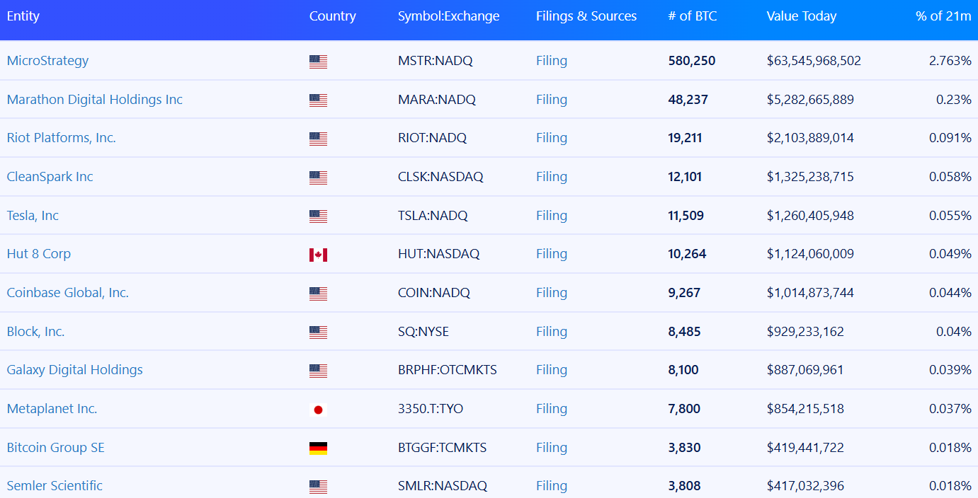 De grootste bedrijfsbitcoin -investeerders. Bron: Bitbo