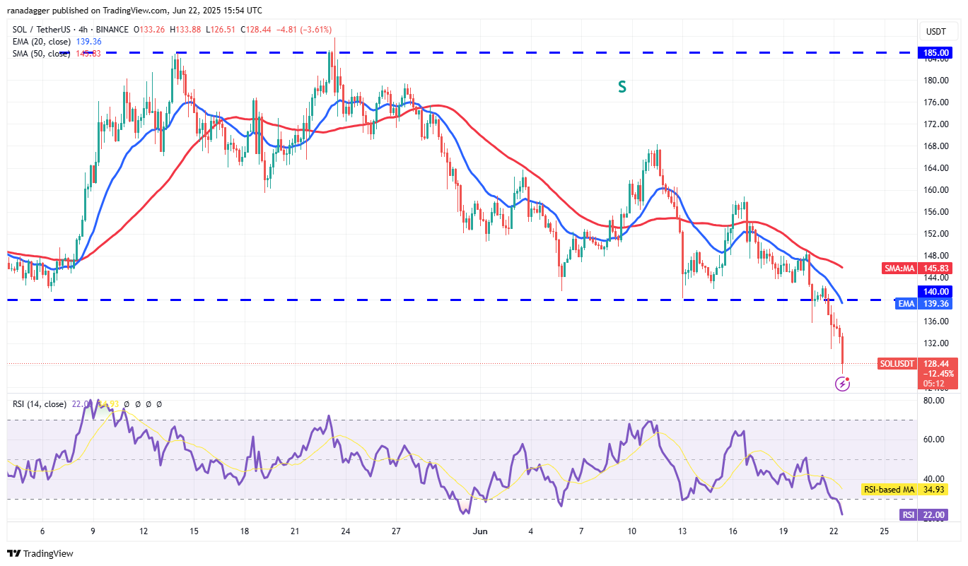 Bulls proberen misschien een rebound te beginnen, maar ze kunnen geconfronteerd worden met een uitverkoop bij de EMA van 20 dagen ($ 148). De Sol/USDT kan dalen tot $ 110 en vervolgens naar $ 93, als de prijs omkeert van de EMA van 20 dagen.