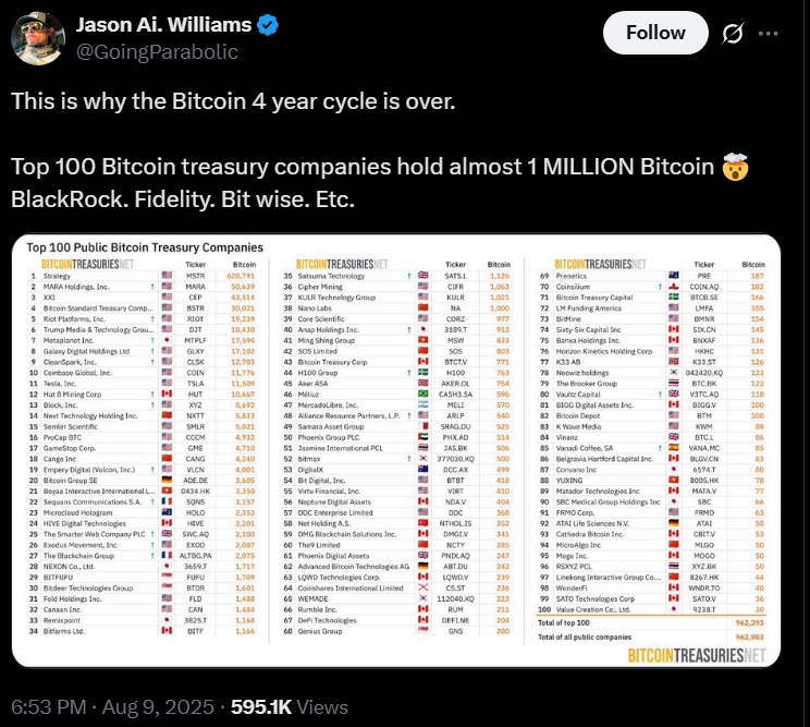 Jason Williams, een auteur en investeerder, heeft de groei van Bitcoin Treasury-Hold-bedrijven aangehaald als een reden waarom hij overtuigd is. “De Bitcoin 4 -jarige cyclus is voorbij.”