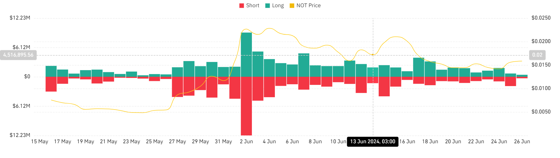 De RSI van NOT is in dit geval de afgelopen 24 uur verschoven van 44 naar 51. Een stijgende RSI duidt op een verschuiving in het marktsentiment van bearish naar bullish.