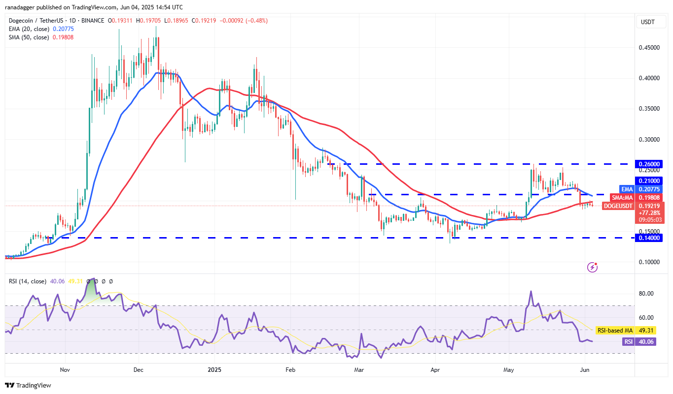 DogecoinDOGEHet 50-daagse eenvoudige gemiddelde ($ 0,19) heeft stabiel gehouden en een gebrek aan agressieve verkoop op lagere niveaus.