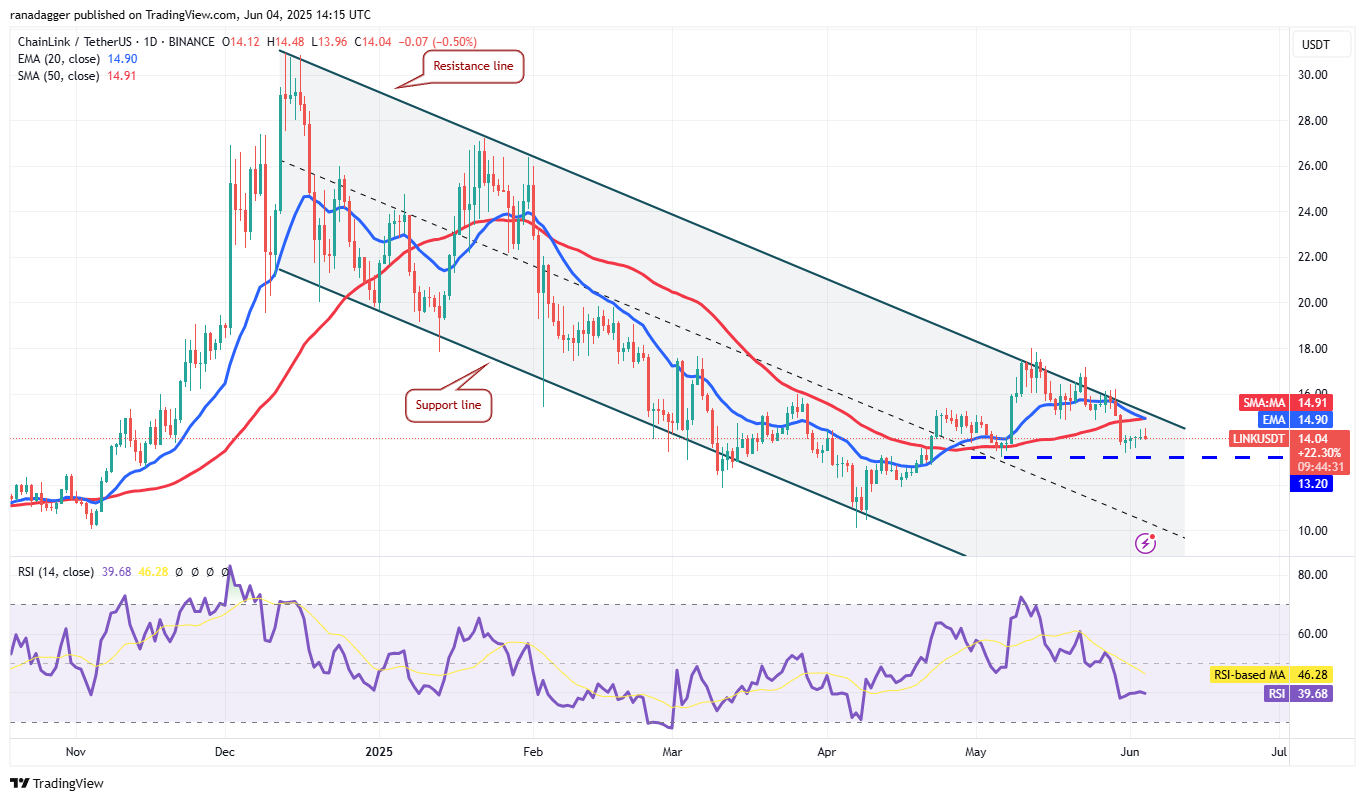 KettinglinkLINK() is gestegen vanaf $ 13,20, het ondersteuningsniveau op 31 mei, maar de verkopers blijven in de buurt van het verzet van het dalende patroonkanaal.