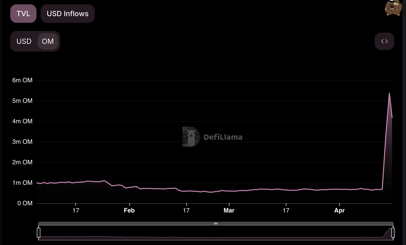 Volgens Data Resource is Mantra’s TVL (in termen van OM) in slechts twee dagen met meer dan 500% gestegen om 4,21 miljoen OM te bereiken ($ 3,24 miljoen). Overstuur.