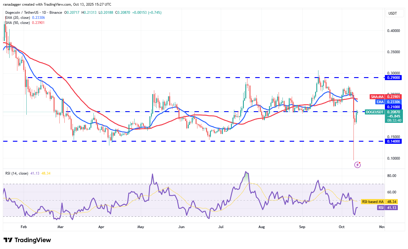 Dogecoin heeft zich sterk hersteld en is teruggekeerd naar het bereik van $0,14 tot $0,29. Bulls kunnen proberen de prijs op te drijven naar de 20-daagse EMA ($0,23), wat kopers zal aantrekken. De DOGE/USDT zou kunnen dalen naar $0,16 en $0,18 als de prijs onder de 20 dagen EMA daalt.