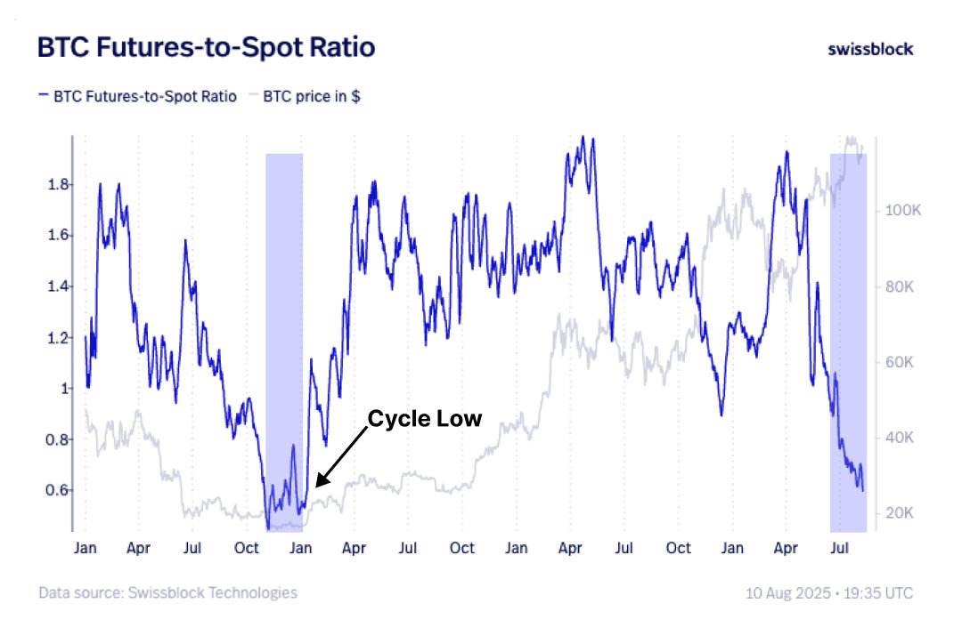 De verhouding tussen leveraged futures en spotaankoop is op dieptepunten die niet zijn gezien sinds de laatste berenmarkt van Bitcoin van eind 2022.