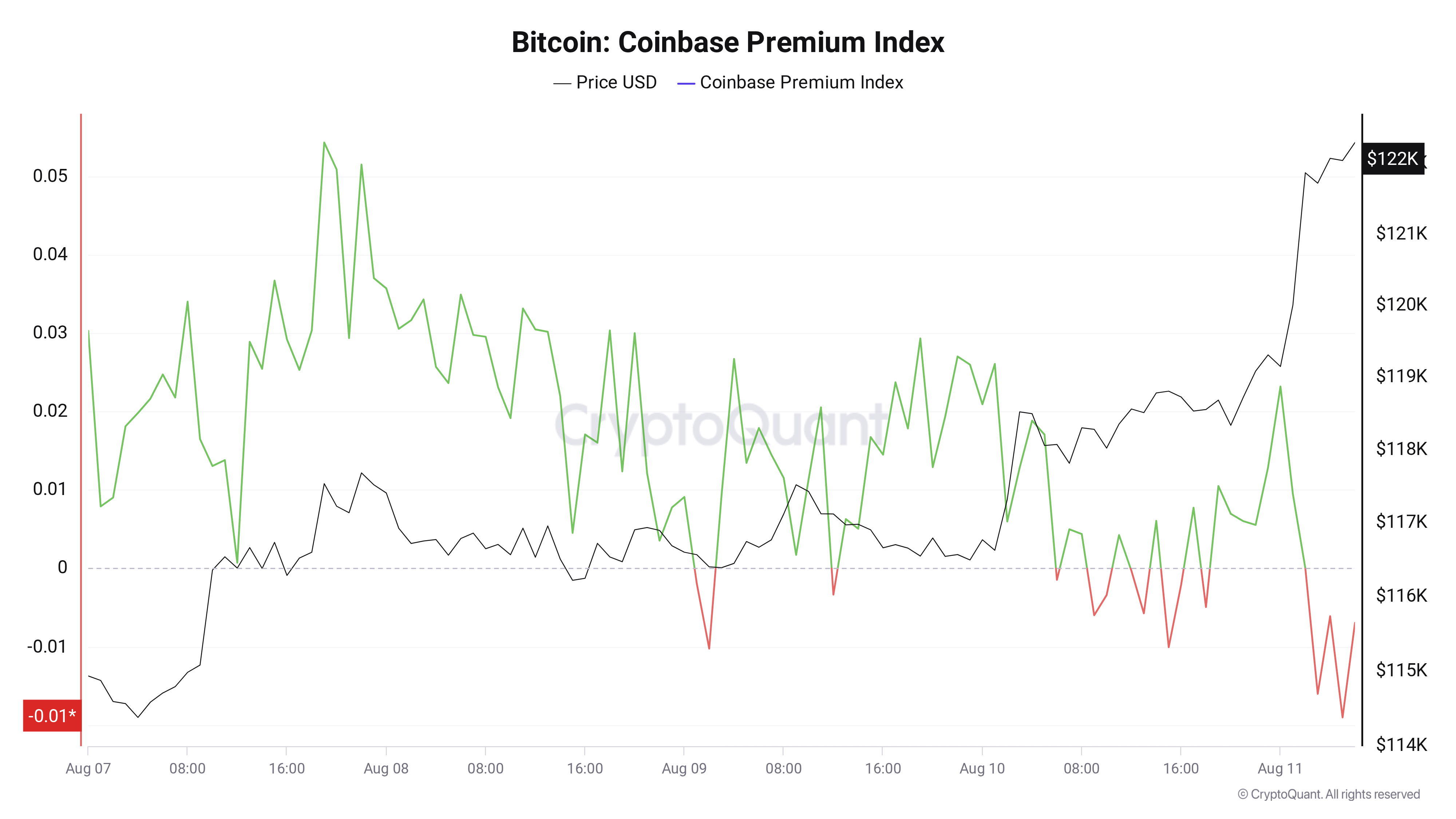 “Prijs sprong eerder vandaag van $ 118k naar $ 122k toen beleggers zich opstapelden. Maar de Coinbase Premium Index omgedraaid rood direct daarna.”