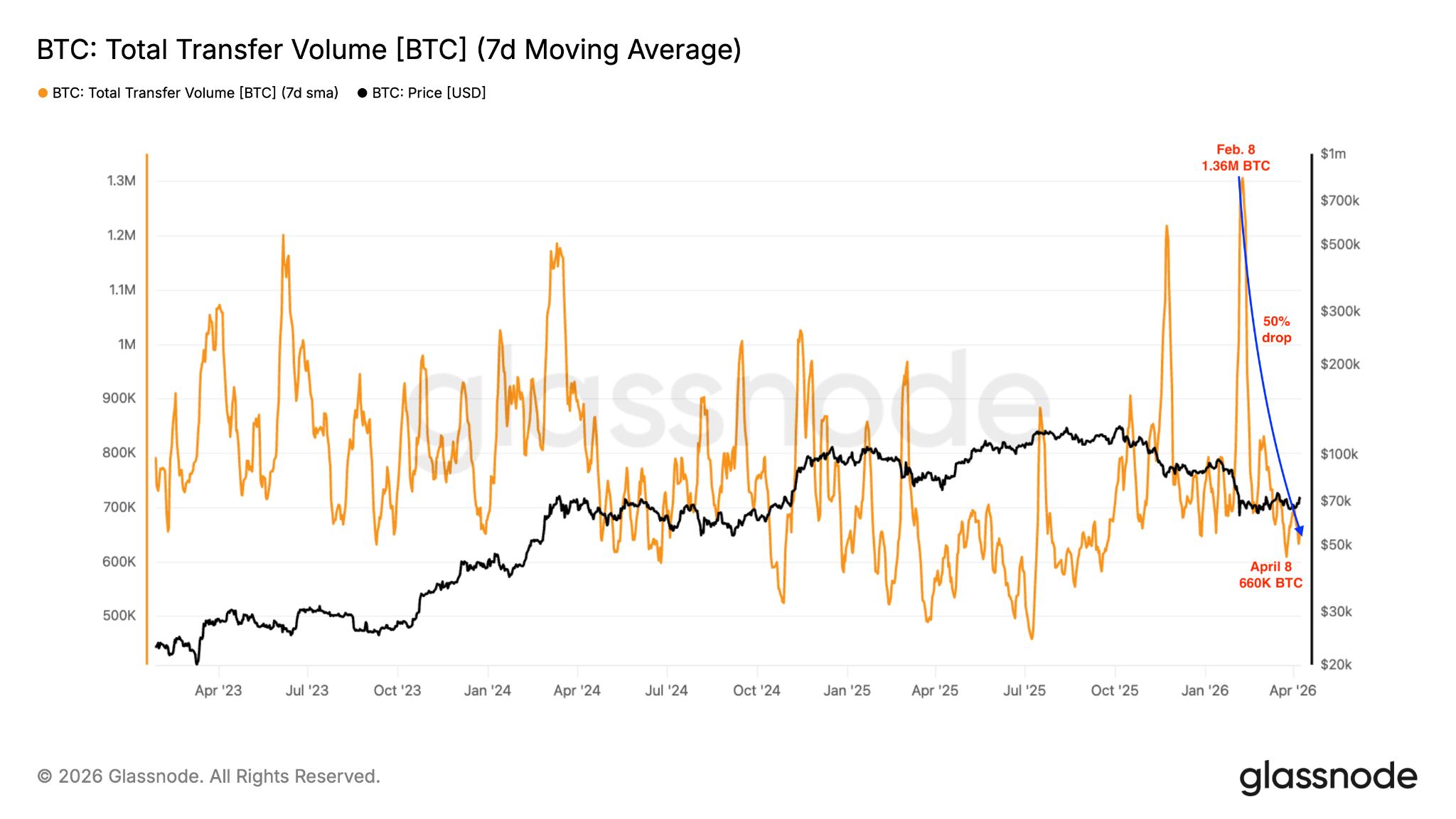 Donderdag is het zevendaagse gemiddelde onchain-overdrachtsvolume met ongeveer 50,5% gedaald van 1,36 miljoen BTC 30 dagen eerder naar 660.000 BTC.