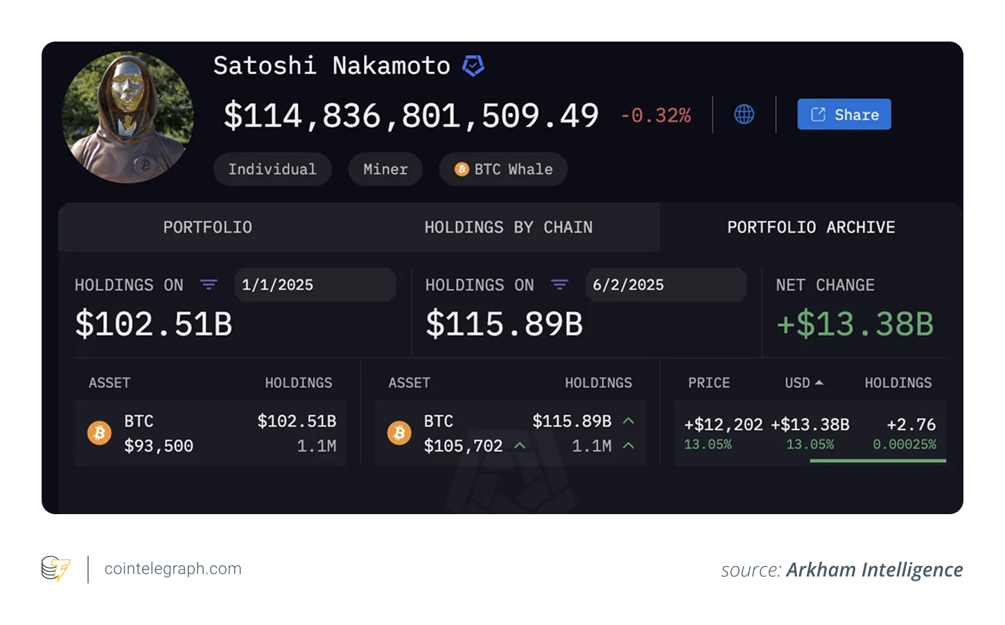 De top is waar de tas Satoshi nakamotoBitcoin -maker ongrijpbaar. Sinds 2010 is zijn (haar) BTC -portemonnee – naar schatting tussen 968, 000 en 1,1.000.000 BTC – onaangeroerd gebleven. De voorraad van bijna 5% alle bitcoin doemt op als een slaaptitan. De markten zullen exploderen in speculatie als het beweegt.
