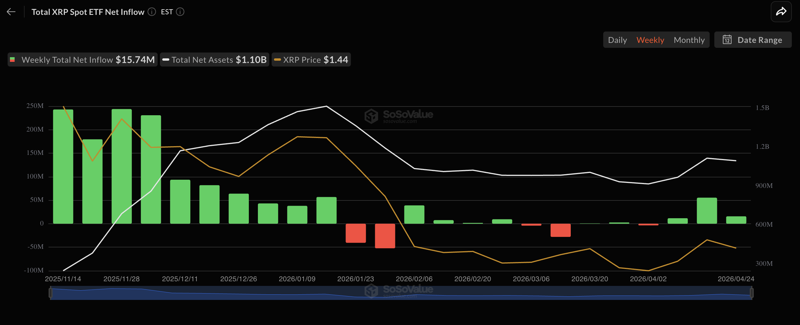 XRP ETF netto wekelijkse stromen. Bron: SoSoValue
